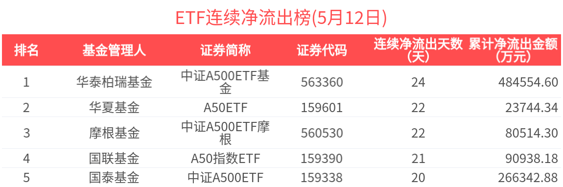 连续净流出的ETF基金有248只,居前的为中证A500ETF基金(24天)、A50ETF(22天)、中证A500ETF摩根(22天)、A50指数ETF(21天)、中证A500ETF(20天),分别净流出48.46亿元、2.37亿元、8.05亿元、9.09亿元、26.63亿元。其中,中证A500ETF基金近24天加速流出,近24天累计流出48.46亿元,基金规模快速下降至96.13亿元。