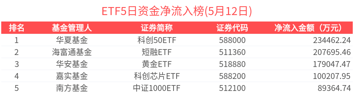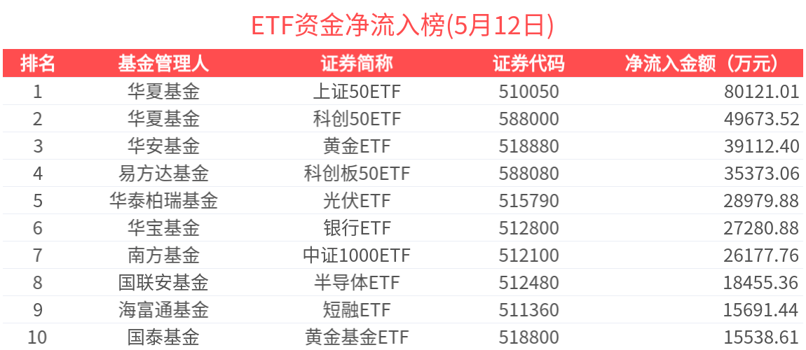 2025年5月12日共247只ETF基金获资金净流入,419只ETF基金净流出。净流入金额超1亿元的有16只,上证50ETF(510050.SH)、科创50ETF(588000.SH)、黄金ETF(518880.SH)、科创板50ETF(588080.SH)、光伏ETF(515790.SH)资金显著流入,分别净流入8.01亿元、4.97亿元、3.91亿元、3.54亿元、2.90亿元(净申购份额*单位净值)。